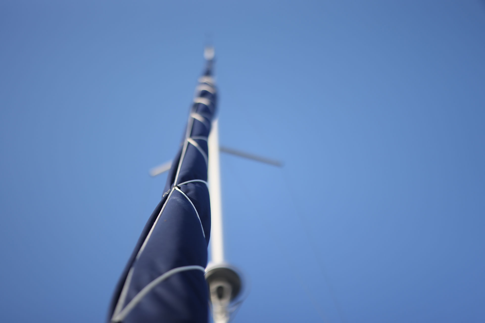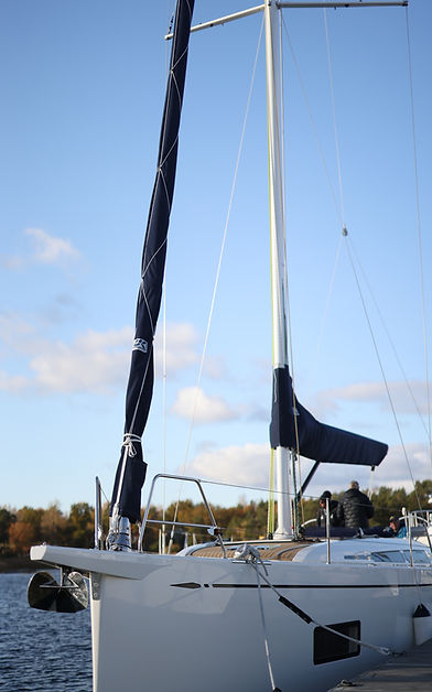 Bomkapellet träs över det nedtagna storseglet på bommen för att skydda det mot väder och vind. Bomkapell fästs fram på masten med dragkedja.